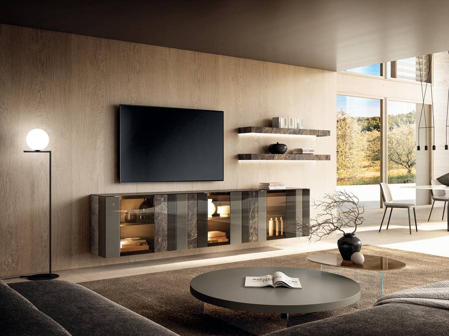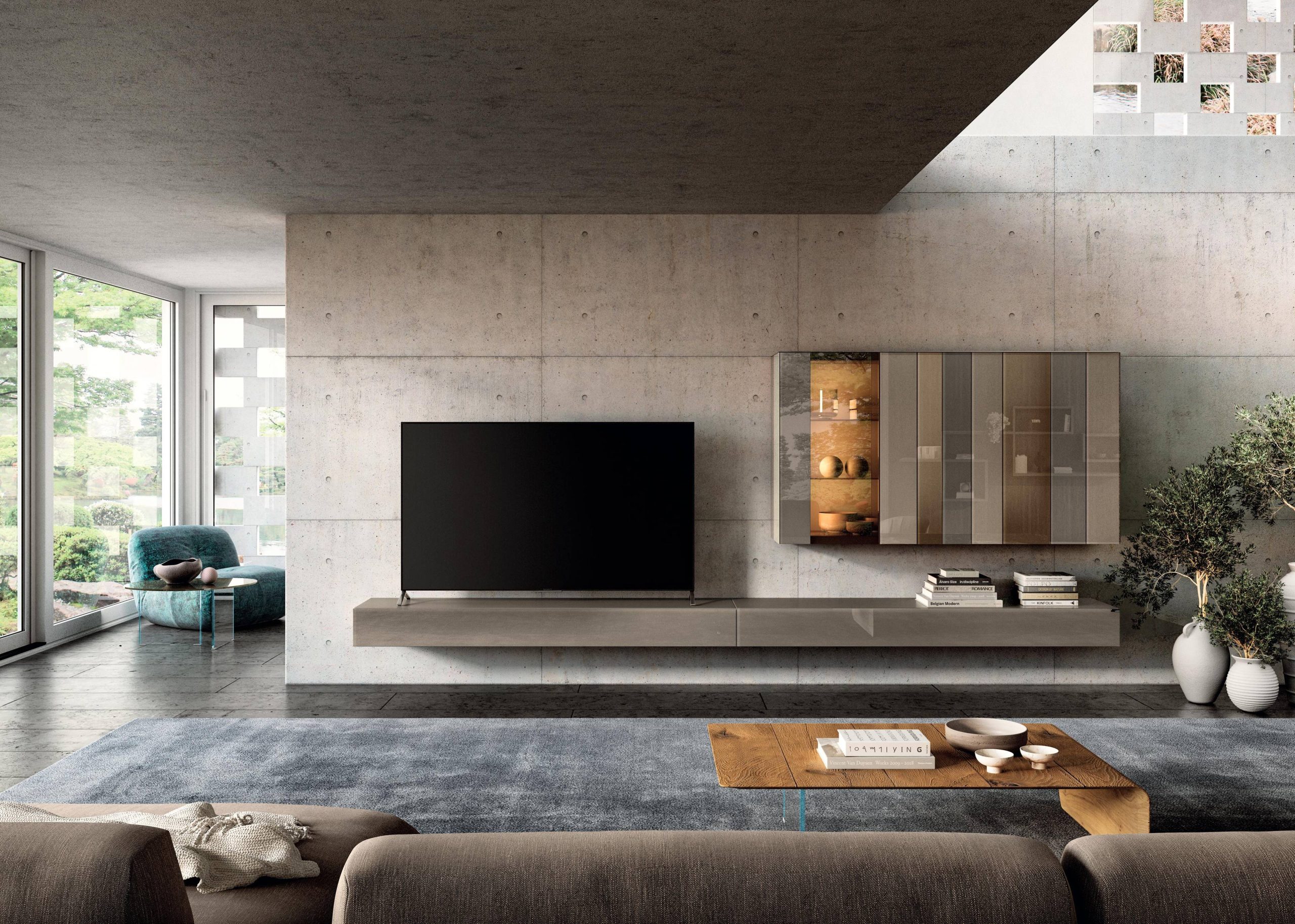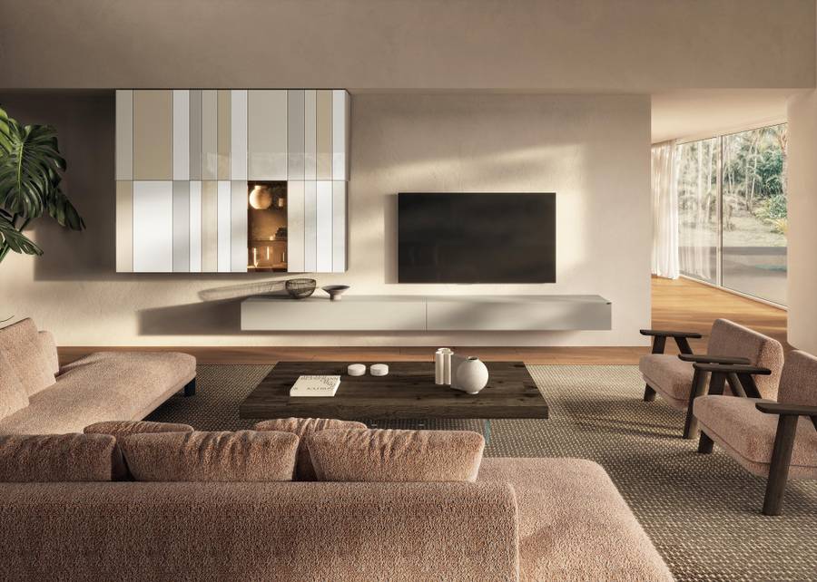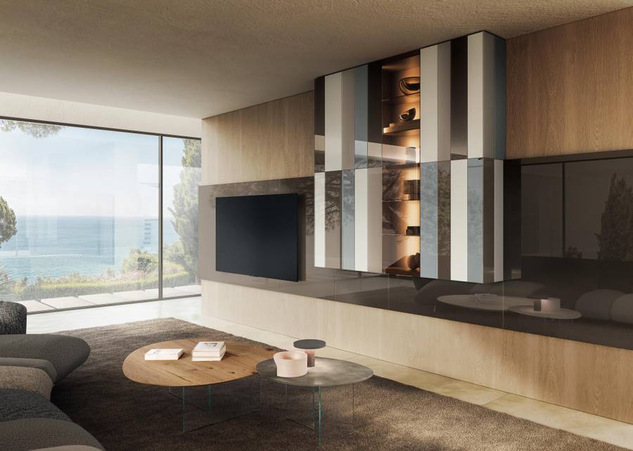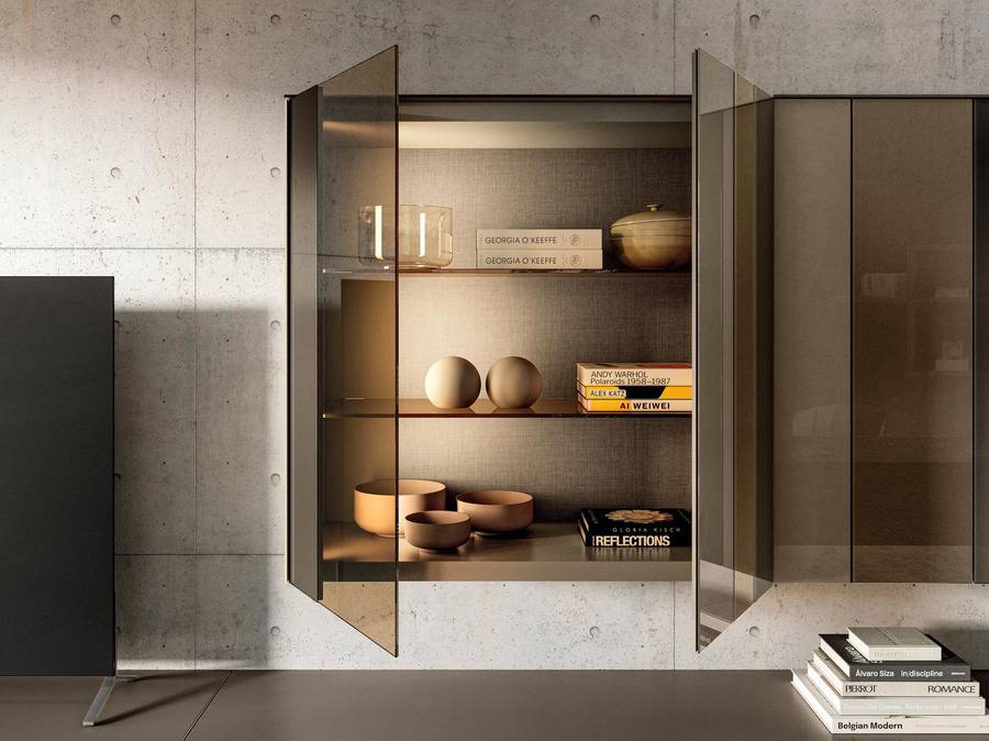 La parete attrezzata diventa estremamente funzionale grazie ad un grande volume contenitivo con apertura brevettata, reso leggero e dinamico dalla sospensione e dal ritmo delle fasce in vetro, di diverse misure e personalizzabili singolarmente. N.O.W. può accogliere eleganti ante in vetro trasparente bronzato che, arricchite da un sistema di illuminazione, mostrano un empatico dialogo tra esposizione e contenimento. Un elemento d’arredo modulare che si adatta ad ogni spazio ed esigenza di contenimento.